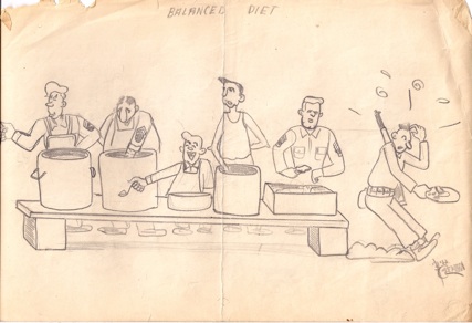 This cartoon is an impression of a mess line. To be fair, servings were usually much larger; and there were seconds.