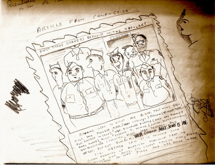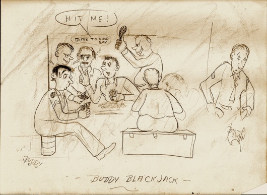 Regular Army non-coms and officers ran our basic training battalion. Most were men who couldn’t make it in civilian life and took refuge in the Army during the Depression. They were the objects of several of my cartoons.