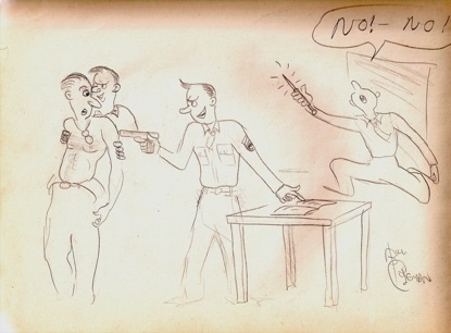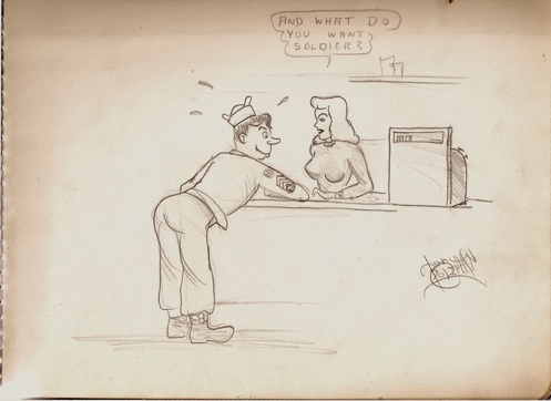 The above cartoon was drawn shortly after I was discharged in the summer of 1946. A few were drawn when I was in basic Infantry training. Of course, none were drawn while I was in combat. Some were drawn while I was still eighteen, some after I turned nineteen.