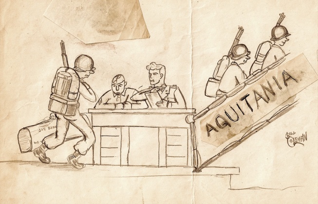 One night with only short warning we took a train to the New York docks and boarded the British liner, the Aquitania. We were not reassured when we learned it was a sister ship of the Titanic. It carried more than 10,000 soldiers. The ship loomed several stories above, and there were several gangplanks. We struggled up into the ship with our heavy backpacks as a band played “Over There.”