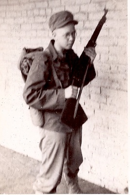 Here I am, a 17 year-old soldier, armed and dressed in fatigues. We were about to march 20 miles to a bivouac area outside of Lexington, Virginia.