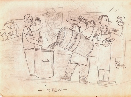 This drawing was made after I returned Stateside. Then German POWs did much of the menial KP tasks we had to do during our basic training.