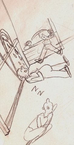 I don’t have a copy with the colors I used, so I have to make do with this black and white pencil rendering.