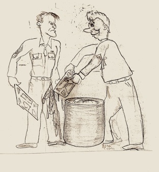 We all served our time on KP – Kitchen Police. Our assignments were made alphabetically. There were mandatory ten-minute breaks on the hour. Many worked very hard at getting out of work. I am not guiltless in that respect. The Army term for this was “gold-bricking.”